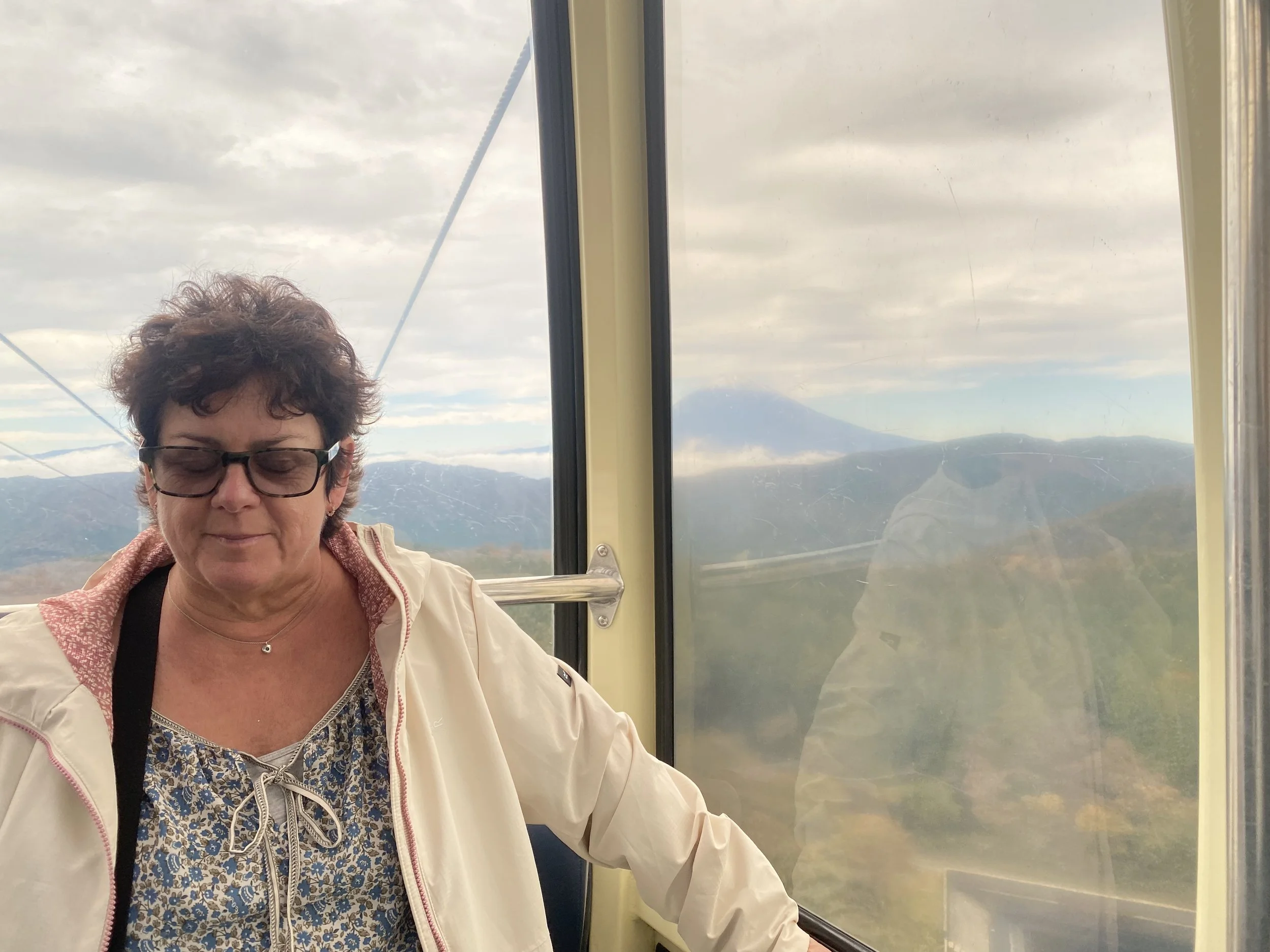 The mountain was still very much in view for the last stage of cable car decent had it not been for the discoloured plastic windows of the car. It didn’t make any difference to Pauline as she had her eyes closed!