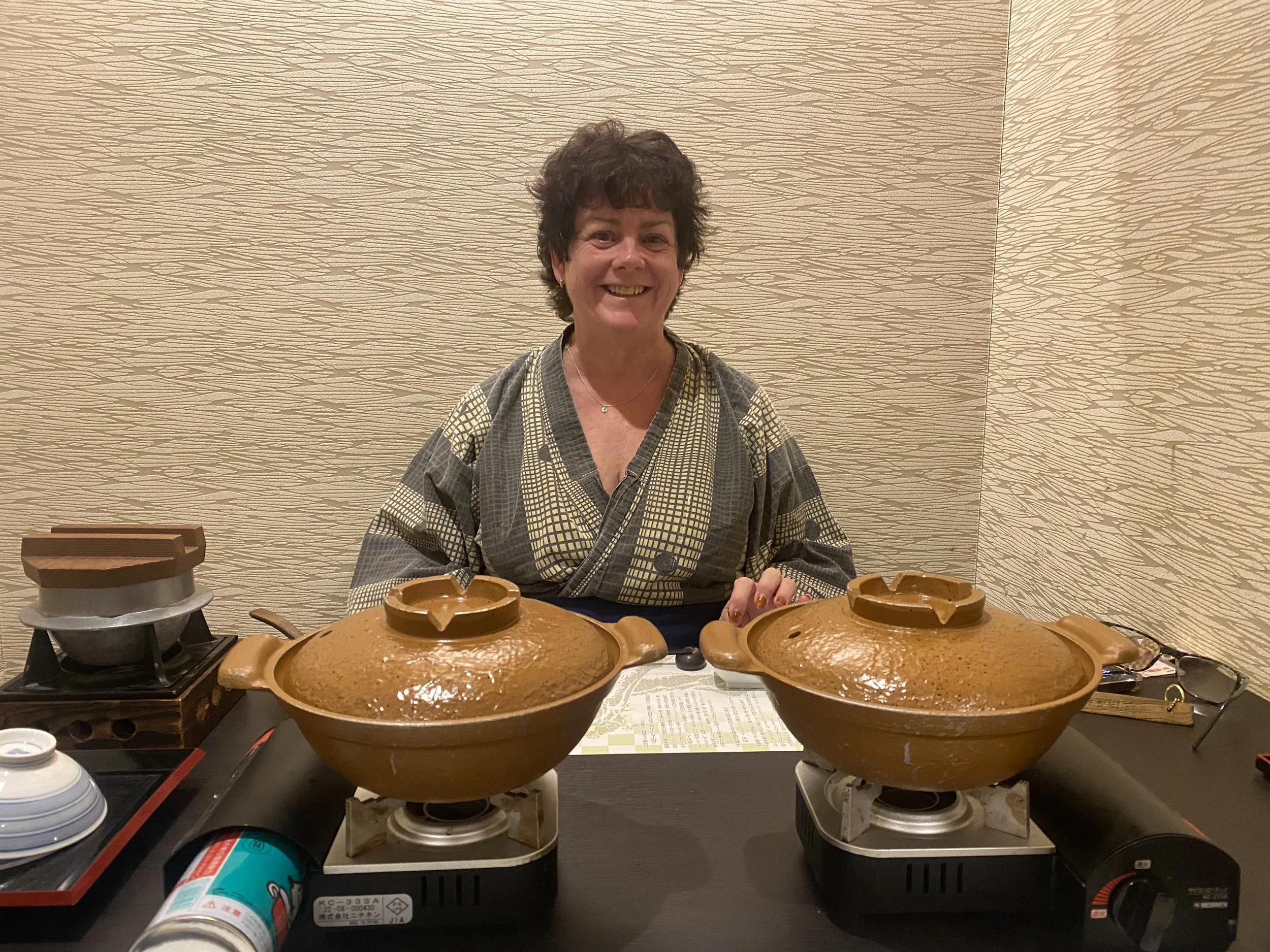 Feeling refreshed and rested we dressed up in the garb provided and went down for dinner. Kaiseki involves cooking for yourself at lot apart from the stuff that is raw like the sushimi so, in spite of all of the fuss about it, it’s actually a complete cop out for the chef.