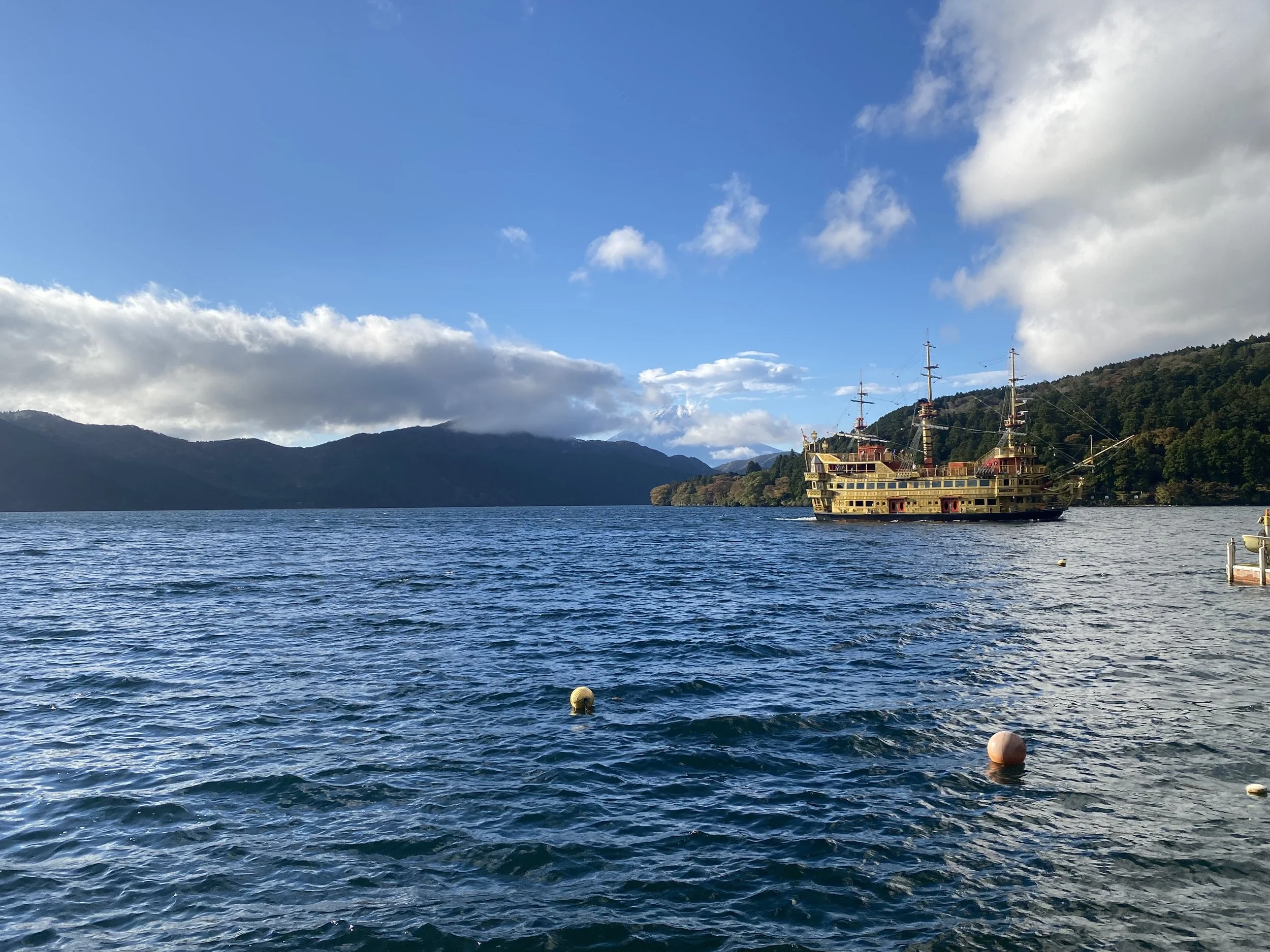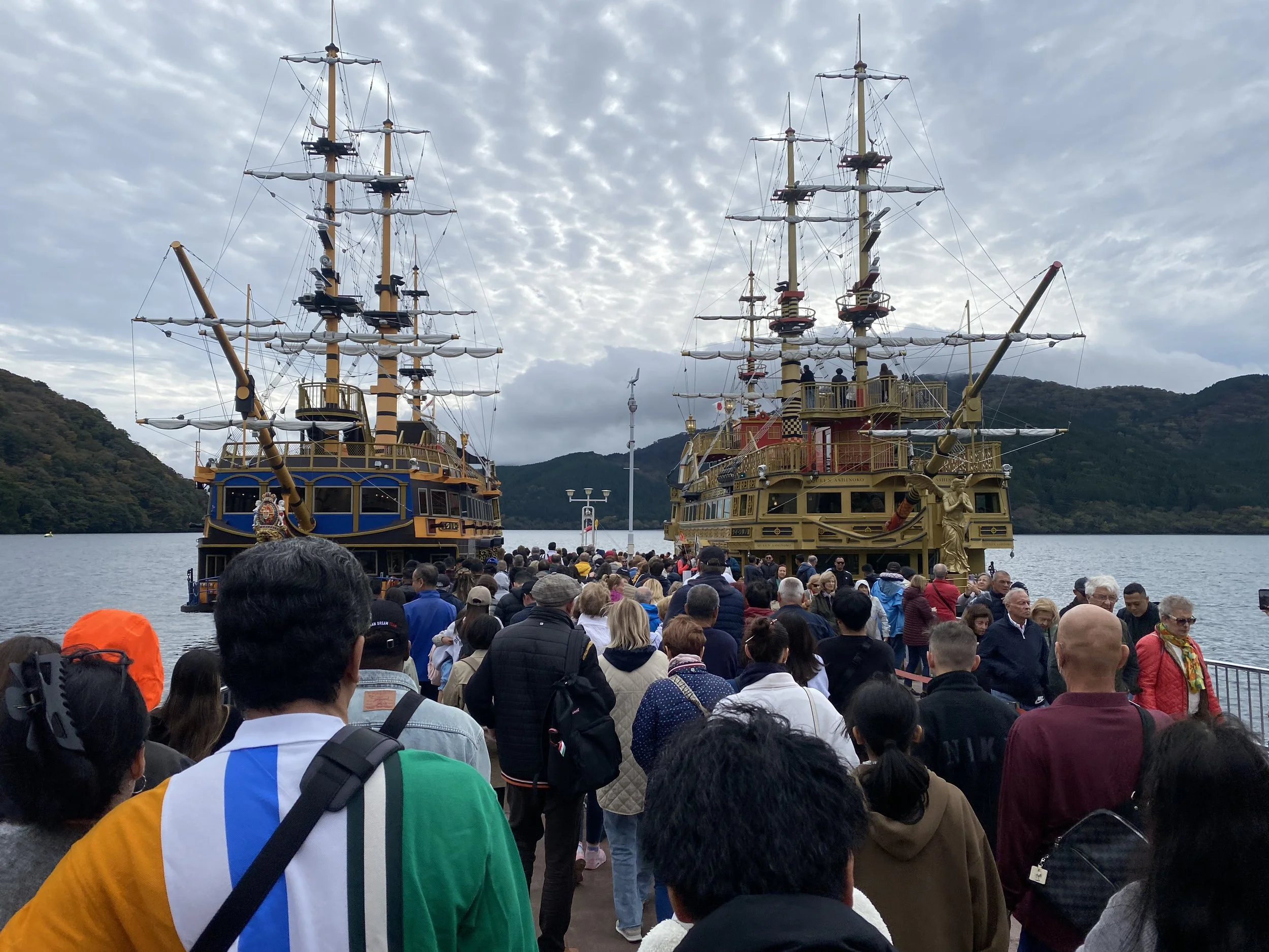 Lake Ashinoko formed as a pocket of space between ancient lava flows is filled with 30 metre deep water that is kept from freezing all year round by the permanent underground supply of hot spring water. Pretty handy for sailing pirate ships across it all year round. Why anyone decided that this design would make the experience any more special is beyond me unless it is just intended to make the sheep tourists feel like they are being totally taken for mugs.