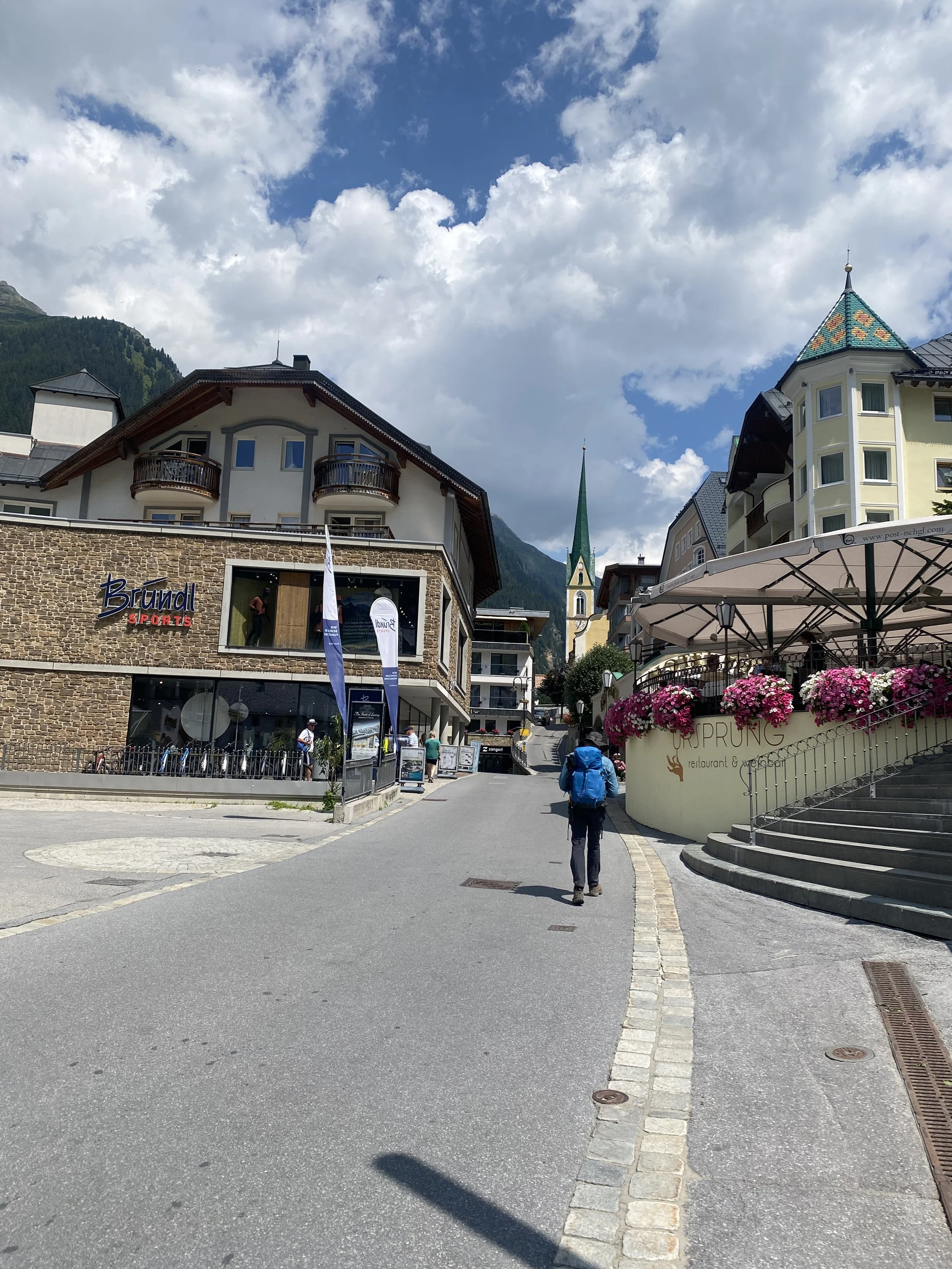 We set off downhill and were soon at the bottom of the valley with a cup of coffee in hand. John was keen to catch a bus to Ischgl where we were staying but I persuaded him that we should walk the 3 miles or so. It was nice to take in a different point of view and take a little more of the morning to get to our destination.