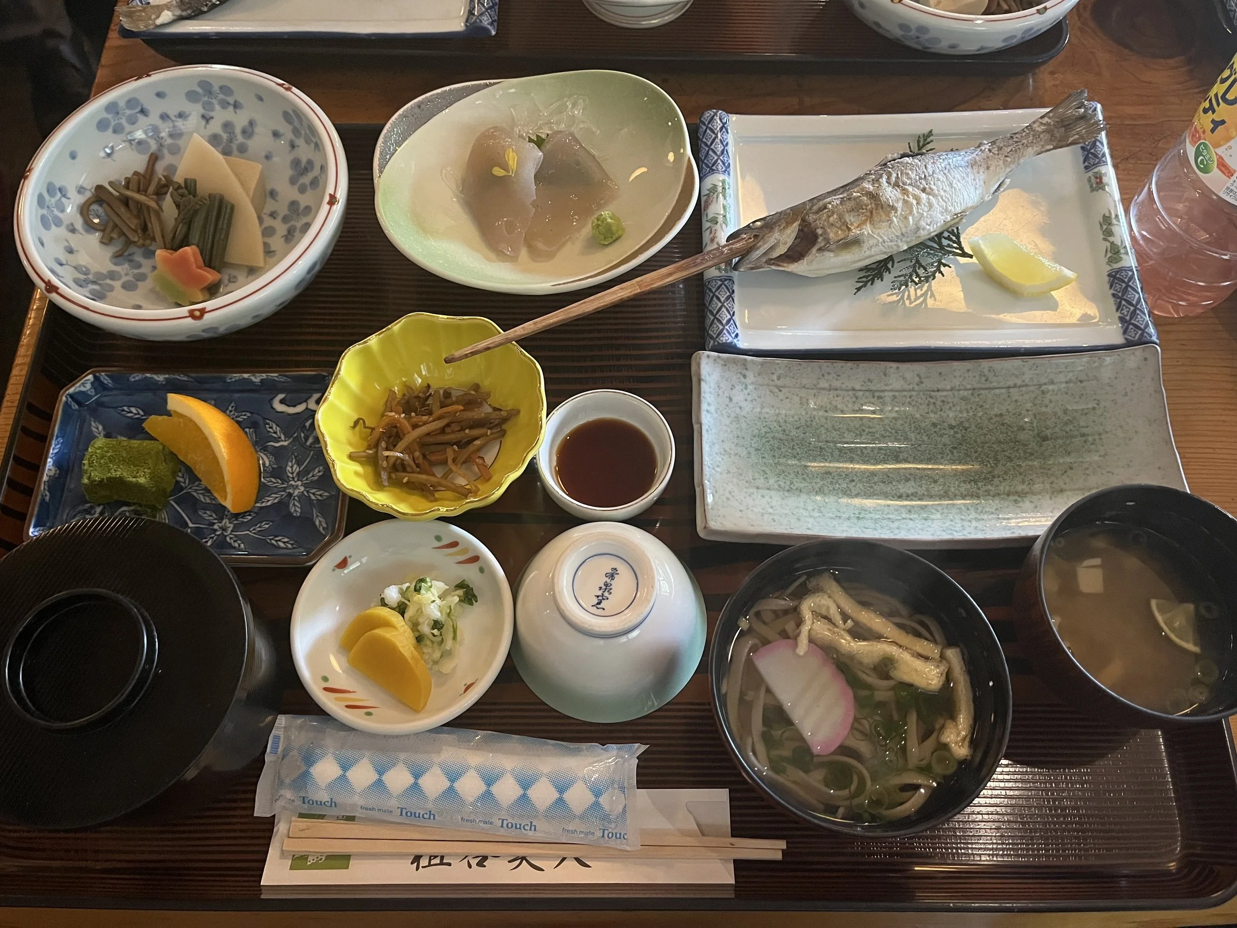 Lunch next which included fish on a stick. Delicious! Although the matcha tea jelly next to the orange was a bit weird in taste and texture.