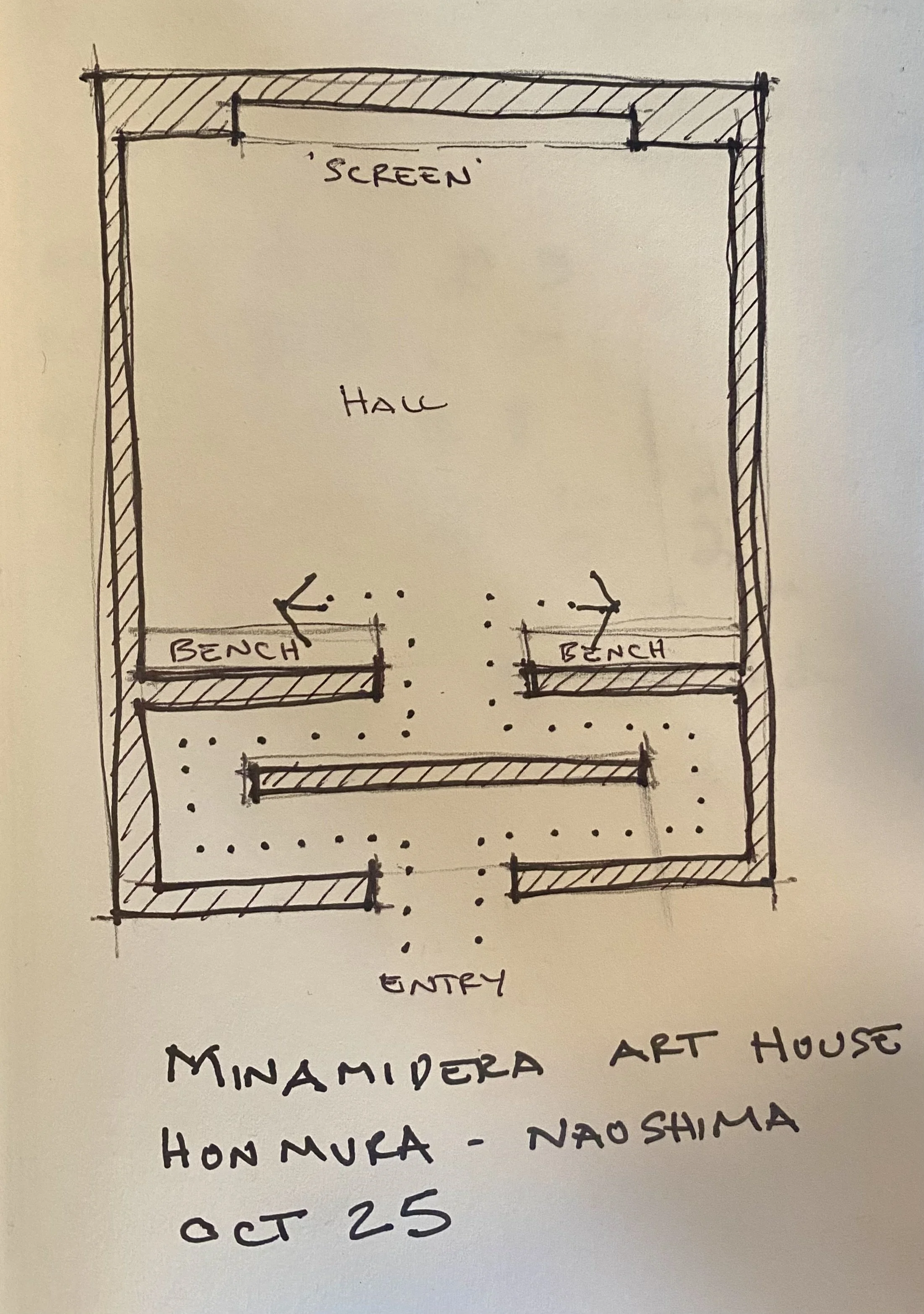 Some of the art installations were thought provoking but the most bizarre and challenging was in the last building that we visiting and is worthy, I feel, of some detailed explanation. No photos were allowed within the building so here is a sketch to show the layout and principal components.